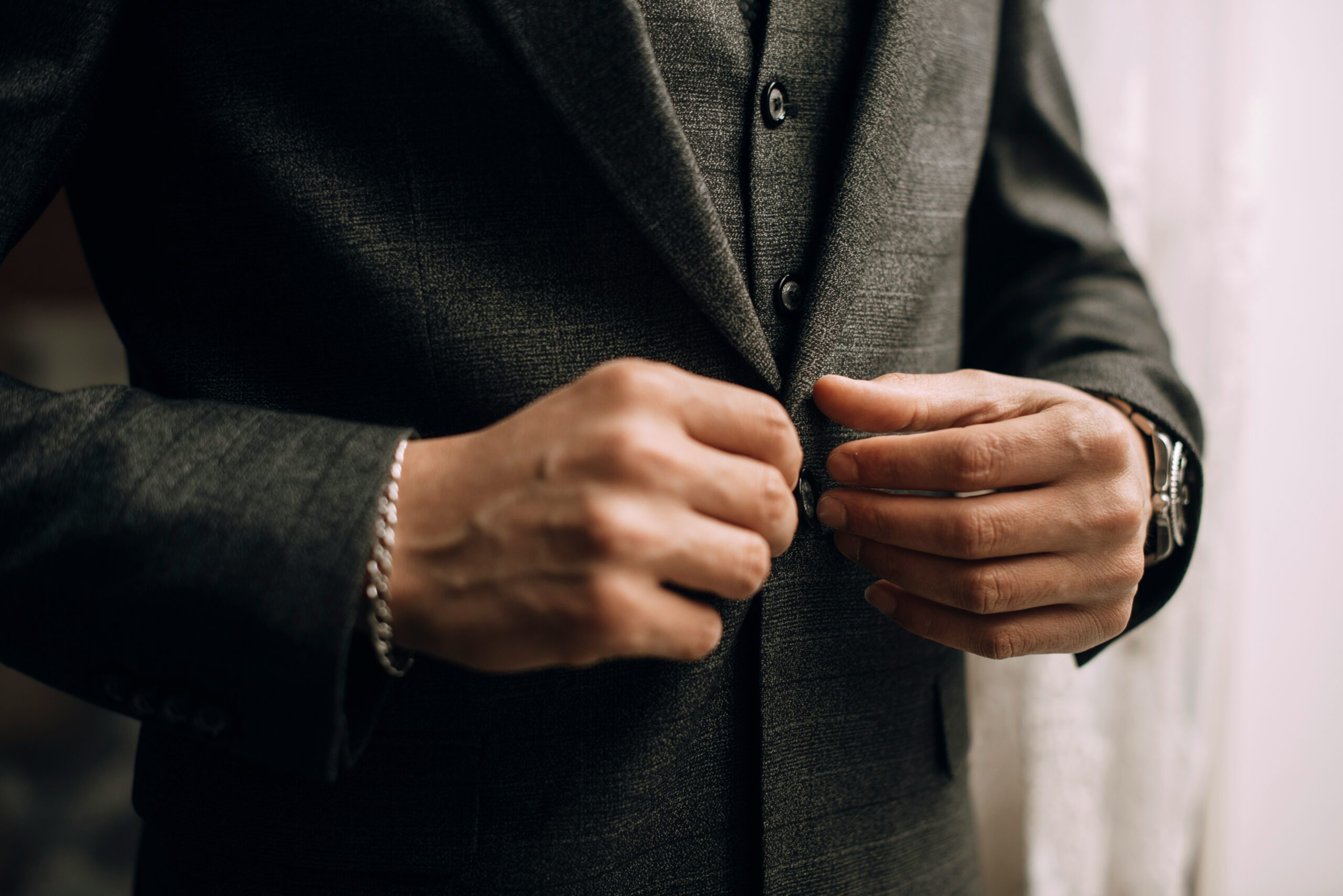 落ち着きと風格を備えた、ダークグレーのスーツ。